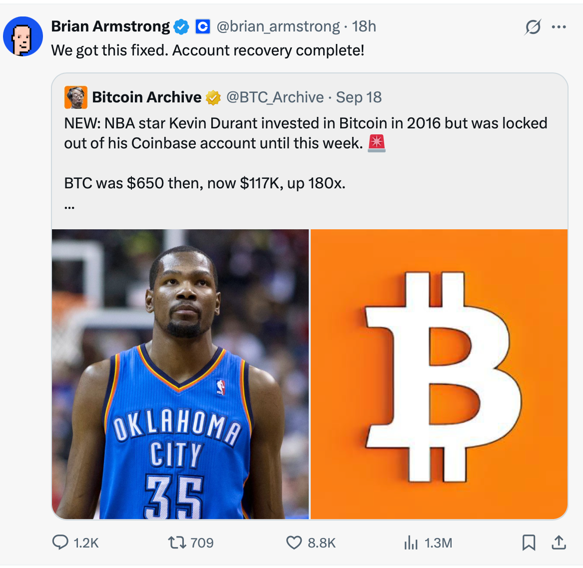 NBA superstar Kevin Durant has successfully regained access to his long-lost Coinbase account nearly 10 years after first buying Bitcoin on the platform, Coinbase CEO Brian Armstrong confirmed Thursday.
