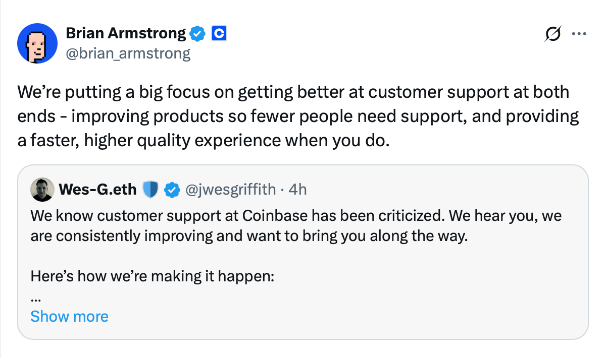 Armstrong addressed the criticism on Friday, reposting a thread from a Coinbase customer support leader that highlighted ongoing efforts to improve service.
