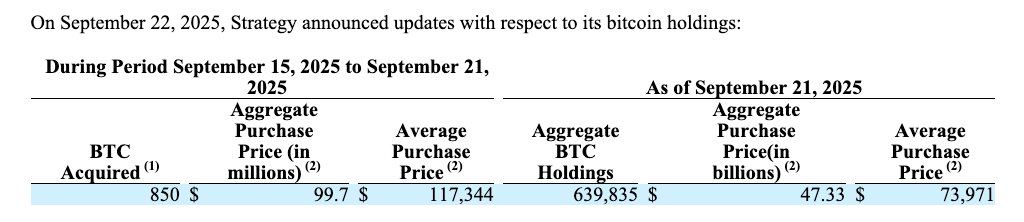 According to a filing with the US Securities and Exchange Commission, Strategy acquired 850 BTC worth $99.7 million during the week ending Sunday. The coins were bought at an average price of $117,344 each, pushing the firm’s total Bitcoin holdings to 639,835 BTC – acquired for roughly $47.3 billion at an average cost of $73,971 per coin.